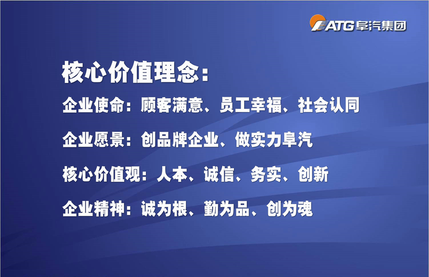 “誠為根”----誠信、坦誠、不渝。誠是阜汽人的精神特質(zhì),是進(jìn)德修業(yè)之本”“立人之道立政之本,是阜汽集團生存發(fā)展的基石。